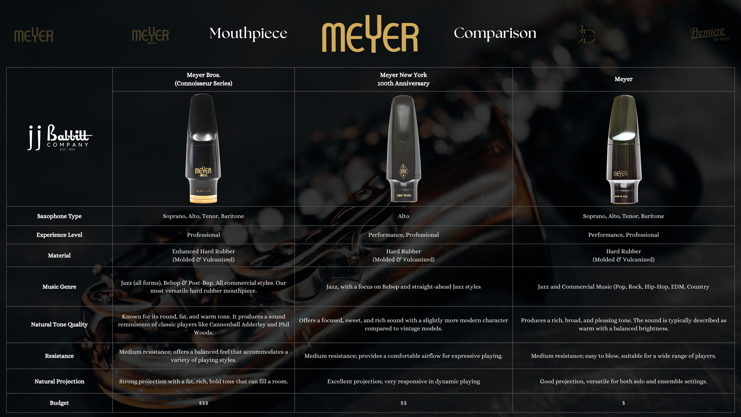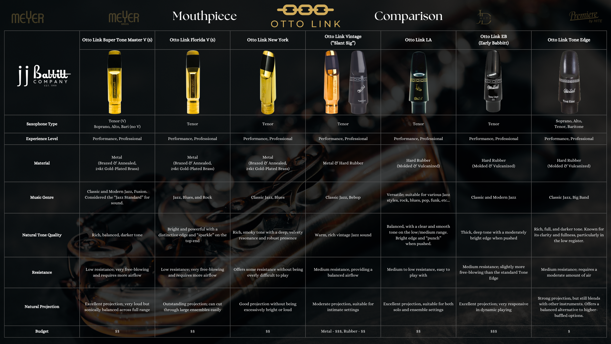 Choosing a mouthpiece is like finding the perfect dance partner—it’s all about the right fit, feel, and flow. Our Meyer and Otto Link comparison guides are here to help you find that ideal match for your sound, style, and soul, highlighting typical sound characteristics and common uses for Meyer and Otto Link pieces.